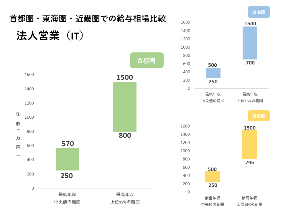 ITの法人営業は、最低年収は250万円、最高年収は1500万円と、非常に幅広い給与相場となっています。首都圏については、2022年度と比較すると、最低年収は変化していません。年収とスキルの相関は、IT業界での法人営業経験や管理職経験。また、外資系企業や企業規模によって大きく変動しています。