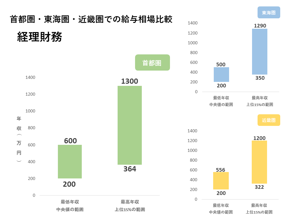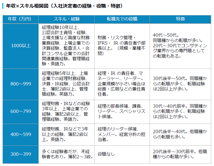 経理財務は、経験年数の他、上場企業での経験や決算・IR経験があるかにより給与が大きく変動しています。