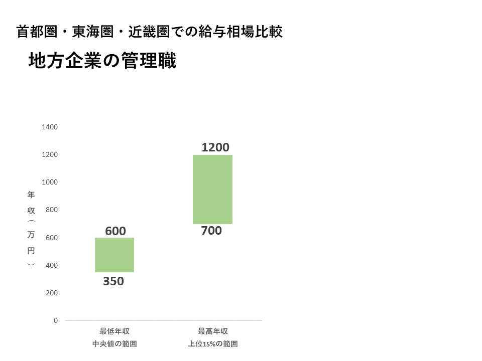 地方企業の管理職は、最低年収350万円から最高年収1200万円と幅広い結果に。大手企業、部長クラス以上は600万円以上想定となり、経験業種や職種によって大きく差が出ています。
